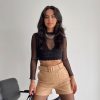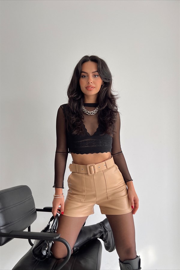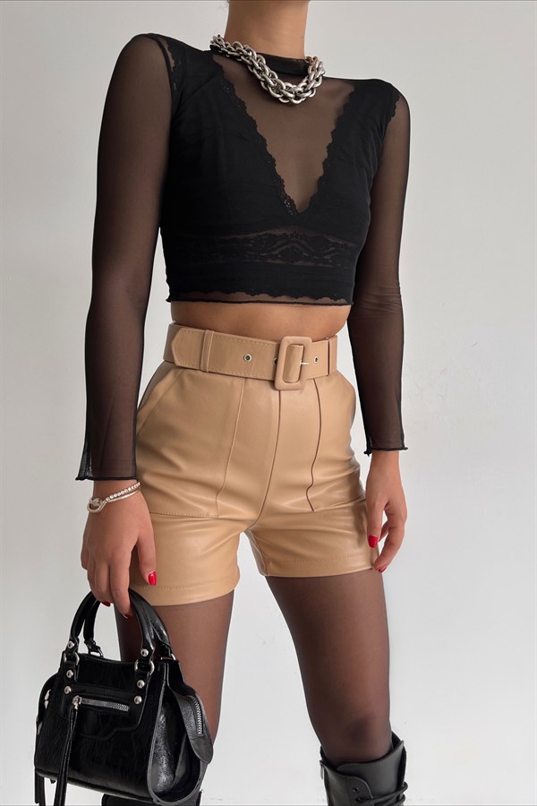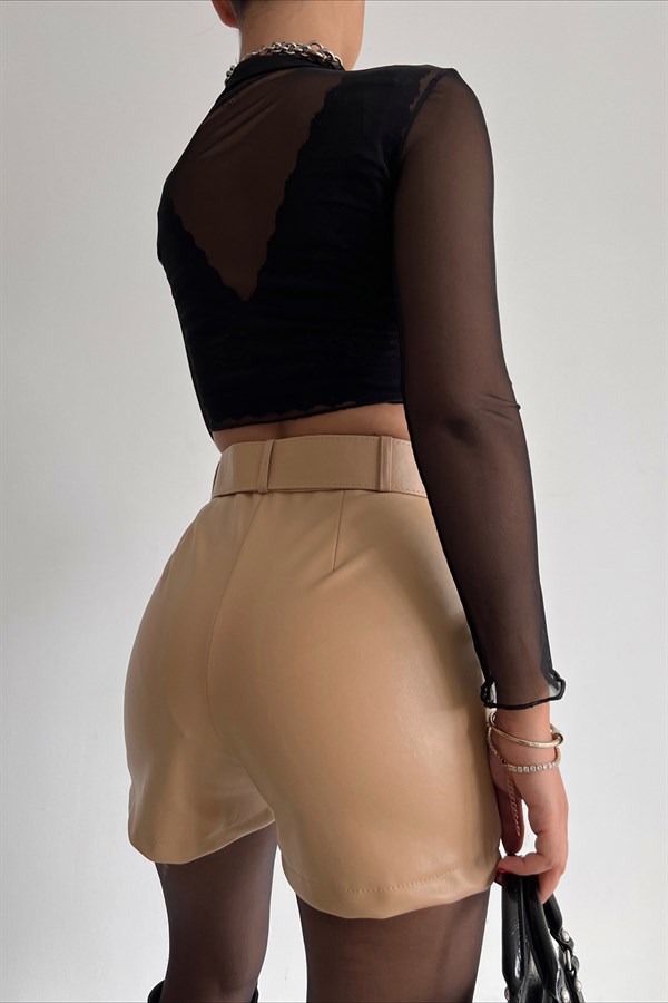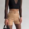 Pocket Detail Belt Leather Shorts Beige -25078 Categories: ,
